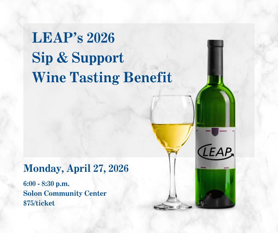 Get ready to enjoy a night of great wine, delicious food, and plenty of fun at LEAP's "Sip and Support" Wine Tasting Benefit! Join us on Monday, April 27, from 6-8:30 p.m. at the Solon Community Center. Click here to learn more and to buy your tickets today!
